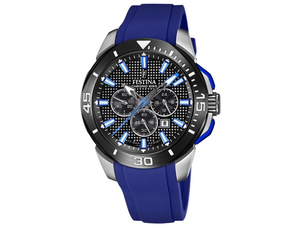 Az óra számlapja nem tartalmaz számjegyeket, ezeket egyszerű, kék árnyalatú indexek helyettesítik. A számlapon kívül a kijelző túlfújt kronográfokkal büszkélkedhet, stopperóra funkcióval. A mutatók, valamint az indexek ezen a modellen lumineszcensek. A gumiszíj kellemesen sima tapintású, klasszikus csatos rögzítéssel. A Festina Chrono Bike óra aktív férfiak számára alkalmas - 100 méterig (úszás) vízállóságot biztosít.